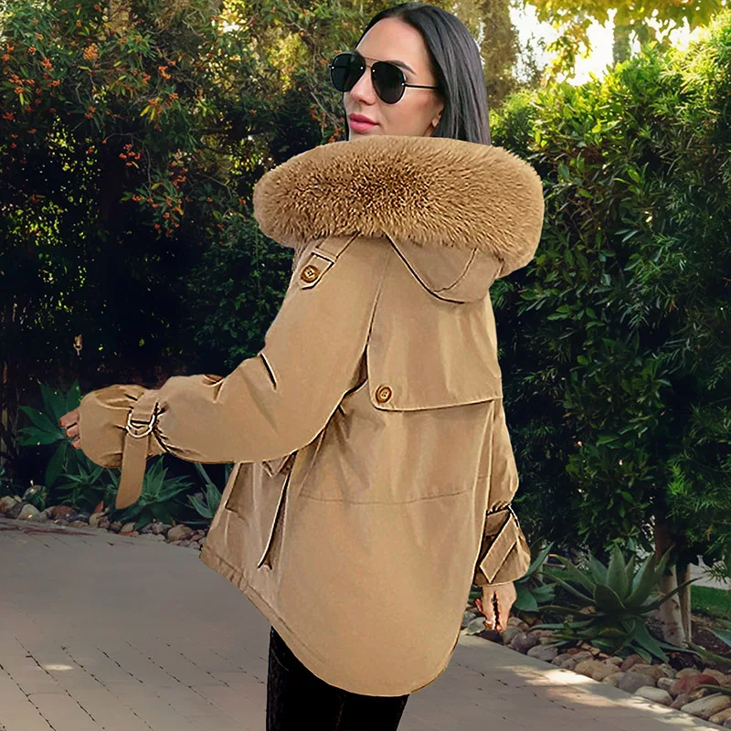 La parka en fourrure pour femme, de couleur beige, avec une capuche épaisse et de grandes poches, offre une élégance douce et une grande fonctionnalité. Sa teinte beige, raffinée et versatile, et par sa capuche épaisse qui offre une protection et une chaleur supplémentaires.