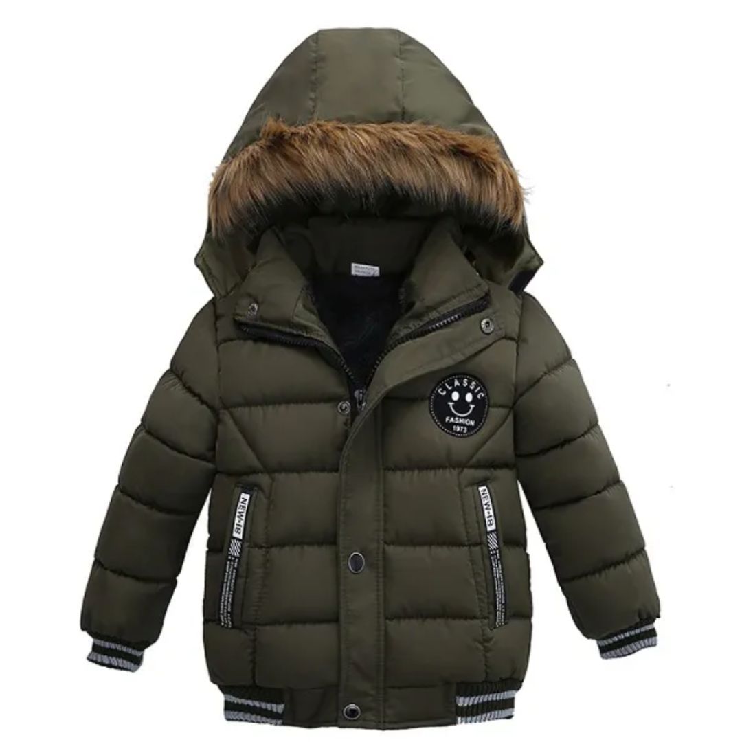 Parka garçon vert kaki avec capuche et fourrure synthétique