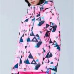 Cette élégante parka de ski pour femme est parée de motifs triangulaires sur une toile rose, alliant style moderne et fonctionnalité. Fabriquée en polyester robuste avec une capuche et totalement imperméable, elle garantit de rester au sec et au chaud pendant les activités hivernales, en apportant une touche de design.